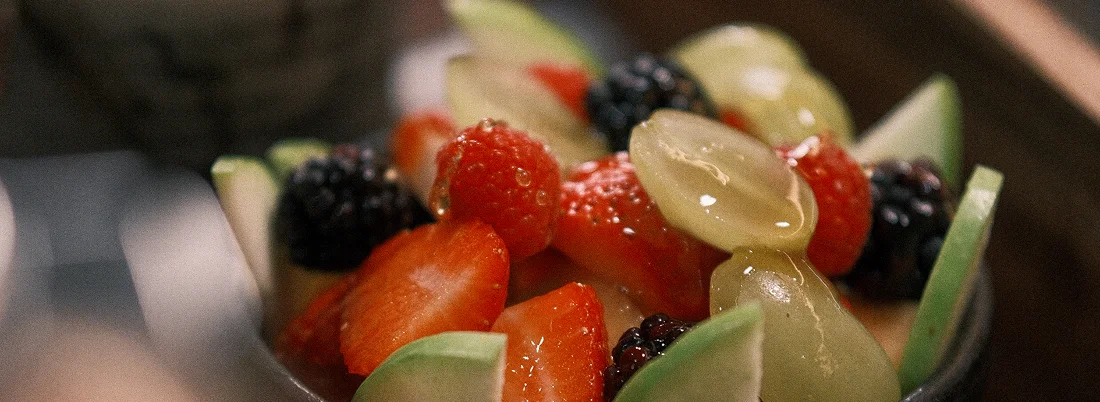 Una colorida selección de frutas de temporada, rociadas con miel orgánica: sencilla, fresca y maravillosamente equilibrada.