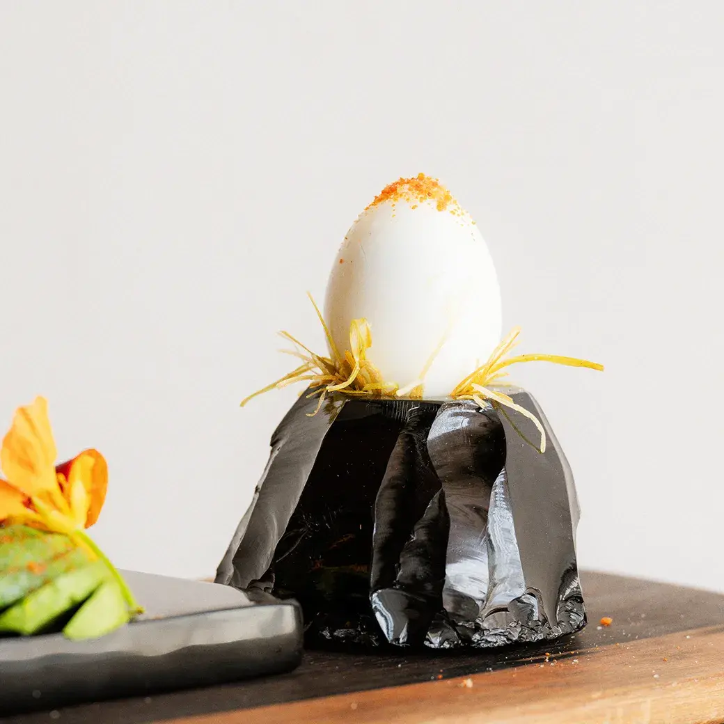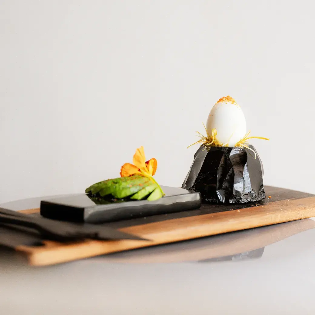 A perfectly cooked egg, crowned with flakes of pink Himalayan salt that burst gently on the palate. Beside it, a silky avocado cream and a crispy golden leek add texture and depth. modificado