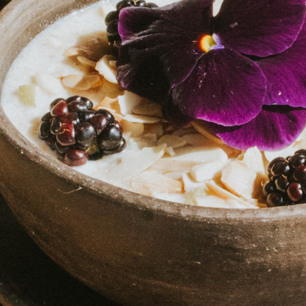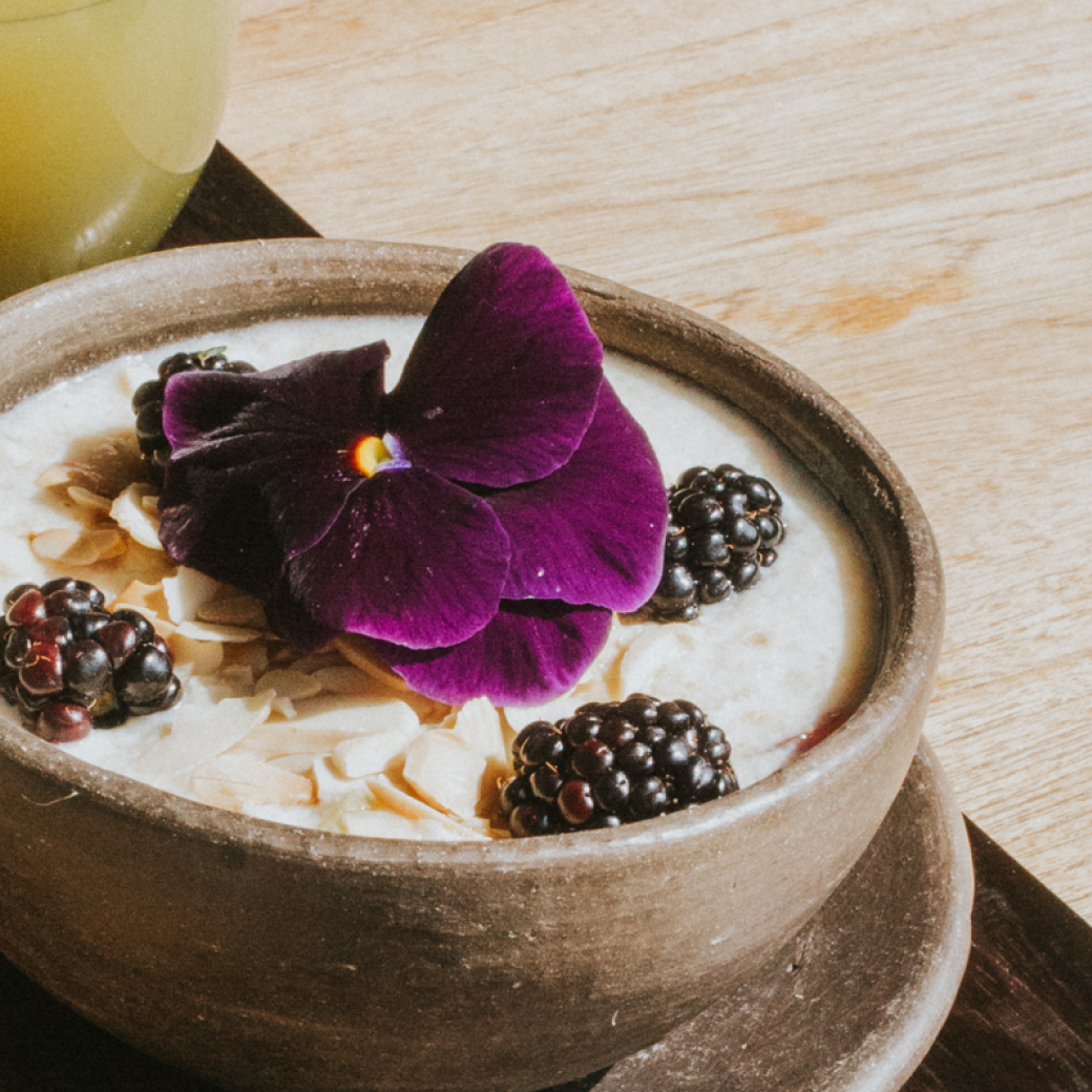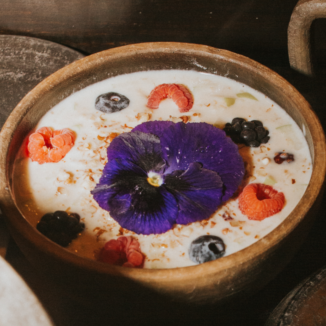 Warm oatmeal crafted with homemade almond milk, sweet apple, honey, crunchy walnuts, and berries — a comforting bowl inspired by local mornings.